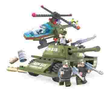 Oferujemy jeden z zestawów klocków, kolekcji ,,Armia”. Ten niespotykany zestaw zawiera czołg oraz helikopter. Pozwala na atak zarówno lądowy, jak i powietrzny. Jest wymarzonym zestawem dla każdego fana militariów. Dodatkowo w zestawie znajduje się dwóch żołnierzy piechoty,wyposażonych w karabiny, pilota helikoptera oraz kapitana oddziału.