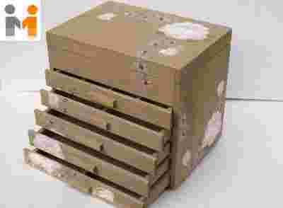 Szkatułka posiada w górnej części dwie przegródki oraz pięć wysuwanych szuflad.
