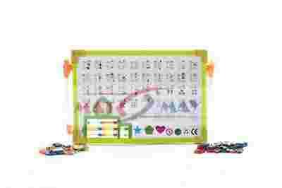 W zestawie znajduje się także mazak suchościeralny z gąbką oraz 50 magnesów z literkami i cyferkami.