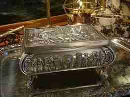 DUŻA SZKATUŁKA STYLIZOWANA CYNA EGIPT HIEROGLIFY