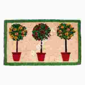 Piękna WYCIERACZKA w kształcie prostokąta została wykonana z grubego włosia kokosowego. Bardzo odporna i wytrzymała. Dodatkowo, ozdobiona nieprzeciętnym wzorem 3 DRZEWEK w DONICZKACH. Ślicznie i żywe kolory nadają jej uroku. Doda przytulności każdemu wnętrzu! Od spodu pokryta gumą, aby zapobiec jej przemieszczaniu.