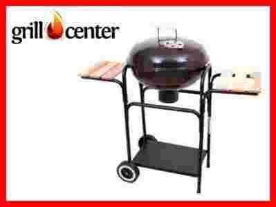 Niezwykle funkcjonalny grill kulisty, wykonany z blachy stalowej, na podstawie ruchomej (wózku), pokryty lakierem proszkowym ogniotrwałym, miska paleniskowa oraz pokrywa emaliowane, chromowany ruszt.