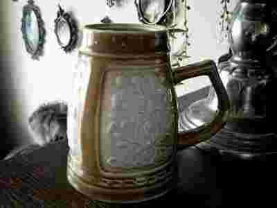 CERAMICZNY KUFEL W SECESYJNYM STYLU, NA UCHWYCIE WADA PRODUKCYJNA-UBYTEK (ZDJ)