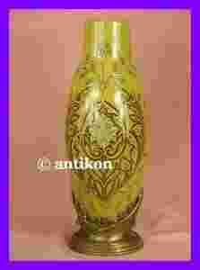 Zachwycający duży wazon w secesyjnym stylu. Krakelurowa porcelana o cudnym miodowożółtym kolorze dekorowana jest ręcznie malowanymi wzorami roślinnymi z rozgałęziających się liści. Naczynie posiada wykonane z brązu okucie, które ozdabiają faliste, wijące się motywy linearne. Na spodzie przedmiotu znajduje się sygnatura. Całość dość ciężka. Stan bardzo dobry.