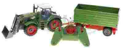 Zdalnie sterowany traktor z przyczepą posiada ergonomicznego pilota, który jest wyposażony w różne funkcje.