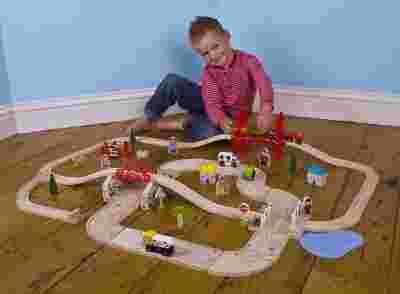 Drewniany zestaw drogowo – kolejowy doskonale nadaje się do zabawy i rozwijania wyobraźni dziecka. Zestaw składa się z przeróżnych elementów w tym również pojazdów, znaków drogowych i budynków. Duża liczba akcesoriów sprawia, że dzieci będą się bawić zabawką bez końca, przy okazji rozwijając również swoją zręczność i koordynację wzrokowo – ruchową.