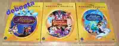 Teraz, po raz pierwszy możecie w pełni doświadczyć magii, cieszyć się niepowtarzalnym humorem i nagrodzoną Oscarem® muzyką, i przeżywać niesamowite przygody z bohaterami wszystkich trzech filmów o Aladynie i jego przyjaciołach. Wszystko to znajduje się we wspaniałym zestawie: ALADYN, POWRÓT DŻAFARA, ALADYN I KRÓL ZŁODZIEI.