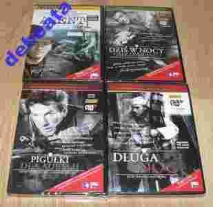 Zestaw 4 płyt DVD z serii KLASYKA POLSKIEGO KINA WOJENNEGO: Pigułki dla Aurelii Kraków, listopad 1943 roku. Żołnierze oddziału Armii Krajowej postanawiają odbić swojego kolegę aresztowanego przez gestapo. Chcą oswobodzić Danka w czasie transportowania go do więzienia. Niestety nie mają broni. Cały ich arsenał dostał się w ręce Niemców na trzy dni przed planowaną akcją. Muszą jak najszybciej pozyskać broń, której w Krakowie brakuje. "Pigułki" są w Kielcach i trzeba je stamtąd przywieźć. Zadania tego podejmuje się student ŻAGIEŁKO (Jarosław Kuszewski), kleryk GUŚ (Andrzej Hrydzewicz), plutonowy URBAN (Zdzisław Kuźniar) i dowódca oddziału "AGAT" (Jerzy Adamczak). Ciężarówką, którą jadą do Kielc, kieruje niejaki Michalak. Nie należy do organizacji, ale został polecony jako pewny człowiek. Broń ukryta jest w kieleckiej fabryce zabawek "Mickey Mouse". Na miejscu okazuje się, że fabrykę zajęło niemieckie wojsko. Dziś w nocy umrze miasto Ranek 13 lutego 1945 roku. PIOTR (Andrzej Łapicki), polski więzień obozu koncentracyjnego, ucieka z transportu ewakuacyjnego przejeżdżającego przez Drezno. Piotr zna to miasto - bywał tu przed wojną, kiedy studiował sztukę. Obecnie w Dreźnie panuje nieopisany chaos spowodowany ofensywą nadciągającej Armii Radzieckiej. Piotr trafia pod konspiracyjny adres, lecz nie otrzymuje tam pomocy... Nie mogąc znaleźć schronienia, tuła się po ulicach i przypatruje ludziom. Wielkie wrażenie robi na nim młoda Niemka, której towarzyszy oficer SS. Tymczasem wieczorem zaczyna się nalot samolotów RAF-u. Piotrowi udaje się dostać do schronu. Samoloty zrzucają tysiące bomb zapalających. Śródmieście Drezna płonie. Zniszczona zostaje drezdeńska starówka i centrum handlowe. Piotr przenosi się do mieszkania pewnego niemieckiego profesora. Po północy rozpoczyna się nalot dywanowy. Płonące budynki zostają doszczętnie zburzone. Uciekając przed bombami i pożogą, Piotr usiłuje wraz z tłumem oszalałych z przerażenia mieszkańców wydostać się z miasta. Spotyka młodą Niemkę, której wcześniej towarzyszył SS-man. Dziewczyna - ma na imię Magda - prosi go o pomoc w ucieczce. Wspólnie spędzają resztę tej tragicznej nocy, wędrując przez spustoszone przez bomby Drezno. W końcu oboje przeprawiają się przez Łabę na drugi brzeg miasta, wolny od pożarów. Tam patrole SS rozdzielają Niemców od obcokrajowców...Film z serii Polskiego Kina Wojennego, który posiada audiodeskrypcję Długa noc Rok 1943, tuż przed Wigilią Bożego Narodzenia. W prowincjonalnym miasteczku gdzieś na wschodzie Polski ślusarz ZYGMUNT KORSAK (Józef Duriasz), lokator kamienicy należącej do rodziny Piekarczyków, ukrywa w tajemnicy przed sąsiadami Żyda, który uciekł z getta. Korsak współpracuje z partyzantami działającymi w okolicy. Ma im dostarczyć broń. Tymczasem Niemcy ogłaszają w miasteczku stan wyjątkowy, tzw. szperę. Kordon niemieckiej żandarmerii otacza miejscowość. Żandarmi zamykają drogi i zaczynają przeszukiwać kolejne zabudowania. Nikomu nie wolno opuścić domu. Osobom, które udzielają schronienia Żydom lub dostarczają im jedzenie, grozi śmierć. Wtedy właśnie mieszkańcy kamienicy Piekarczyków dowiadują się nieoczekiwanie o ukrywanym Żydzie. Rozumieją, że jeżeli Niemcy znajdą go w ich domu, rozstrzelają wszystkich. Właścicielka kamienicy Piekarczykowa, jej wchodząca w dorosłe życie córka Marta, młoda mężatka Katarzyna, której mąż siedzi w niemieckim więzieniu, oraz jej szwagier Józef Katjan stają przed dylematem: wydać Żyda i ocalić siebie czy też milczeć i narażać się na niechybną śmierć. Strach, który pada na lokatorów kamienicy, obnaża cechy charakteru, które w normalnych warunkach zapewne by się nie ujawniły. Katjan grozi Korsakowi, że wyda Niemcom uciekiniera z getta. Agent nr 1 JERZY IWANOW (Karol Strasburger) jest synem Rosjanina i Polki. Do 14. roku życia działa w polskim harcerstwie. W 1925 roku opuszcza Polskę i przenosi się go Salonik, gdzie mieszka jego matka. W Grecji zdaje maturę. Studia rolnicze kończy w Belgii... Nieustannie uczy się języków obcych. Biegle włada angielskim, rosyjskim, francuskim, niemieckim i greckim. Wybuch wojny zastaje go w Grecji. Tam też nawiązuje współpracę z polską placówką wojskową w Salonikach. Zostaje odkomenderowany do dyspozycji wojsk brytyjskich. Przechodzi szkolenie wywiadowcze i dywersyjne w Aleksandrii. Zostaje agentem brytyjskiego wywiadu. W nocy z 13 na 14 października 1941 roku ląduje na greckim wybrzeżu niedaleko Maratonu i jako agent nr 1 rozpoczyna działalność pod kryptonimem 033B. Sam lub ze współpracownikami podejmuje liczne akcje dywersyjne. Nieustannie zmienia wygląd i tożsamość. Jako pracownik portowy zatapia U-booty za pomocą min magnetycznych. Jako pracownik zakładów naprawczych zanieczyszcza zbiorniki z paliwem lotniczym. Niszczy lokomotywy doczepiane do składów ze sprzętem wojskowym i bronią. Przekazuje angielskiemu dowództwu informacje o niemieckich instalacjach wojskowych na terenie Grecji, o ruchach wojsk niemieckich i włoskich oraz o konwojach płynących do Afryki Północnej. Niemcy wyznaczają nagrodę w wysokości 500 tysięcy drachm za pomoc w schwytaniu agenta. Wkrótce na posterunek SS zgłasza się osoba, która wskazuje Niemcom Iwanowa i siedmiu jego współpracowników... Stan IDEALNY , nowe , oryginalne płyty DVD , zafoliowane