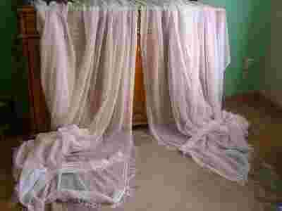 Uszyte są na wielkie okno. Są bielusieńkie z drobnym połyskującym,stonowanym wzorkiem,obszyte ( z góry do dołu i dół firanki )9 cm koroneczką wykończoną frędzelkami U góry obie wykończone taśmą marszczącą z agrafkami u dołu spięte specjalnymi spineczkami tworzącymi głębokie fałdy. Do kompletu należą dwie taśmy ( każda po 130 cm )obszyte tę samą koronką umożliwiające upięcie firanek na boki.