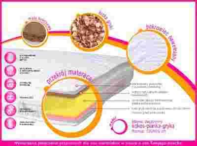 Wymarzone połączeni przyjaznych dla snu materiałów z naturalnych włókien kokosowych i łusek gryki zapewniające stabilne i wygodne ułożenie dziecka, w materacu zastosowano wysokiej jakości piankę bezfreonowo - poliuretanową oraz bawełna to wszystko sprawi że zapewnią dziecku zdrowy i spokojny sen.