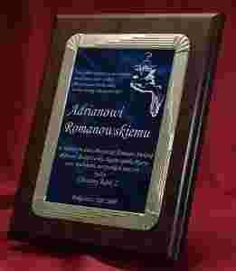 Elegancki wysokiej jakości dyplom naniesiony laserowo na ozdobnej blaszce.