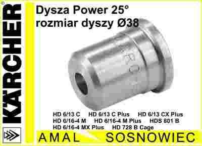 Dysza o kącie spryskiwania 25°. Płaski strumień wysokociśnieniowy o dużej wydajności powierzchniowej oraz dobrej sile odspajania brudu.