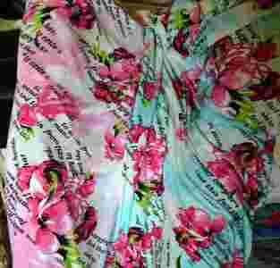 Dzianina elast kolory róż niebieski napisy kwiaty