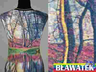 Przedmiotem aukcji jest piękna dzianina elastyczna w oryginalny wzór przedstawiający drzewa w odbiciu wodnym. Tkanina jest mięciutka, bardzo ładnie się układa i nosi, miła w dotyku, zapewnia przyjazną cyrkulacje powierza, elastyczna w każdą stronę, lejąca.