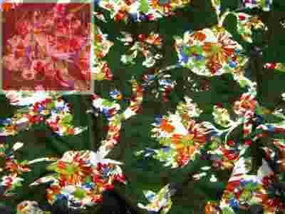 Dość sztywna, grubawa dzianina wiskozowa w kolorze ciemnozielonym w kolorowe kwiaty .
