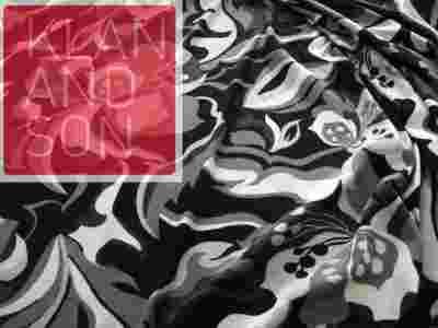 Bardzo cienka, miękka, wiotka, lekko prześwitująca dzianina wiskozowa w duży wzór w odcieniach zieleni, błękitu, szarości i bieli.