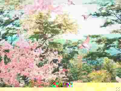 Klasyczna dzianina wiskozowa, jersey, trykot. Cienka, lejąca, lekko elastyczna, miła w dotyku. Materiał z pięknym, oryginalnym wzorem - drzewa i wróble, wzór w formie raportów o długości 115 cm (1,15 m) - kupując kilka kuponów otrzymają je Państwo w jednym kawałku (jednak wzór jest wyraźnie oddzielony nadrukowanym granatowym paskiem - co widać na zdjęciach).