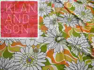 Cienka, lejąca, ciężka, elastyczna, lekko prześwitująca, połyskliwa dzianina wiskozowa (tzw. zimna wiskoza)w duże, białe  kwiaty na żółto - pomarańczowo  - pistacjowym tle.