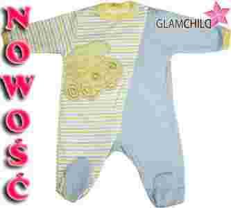 Pajacyk jest w kolorze niebieskim i w biało-żółto-zielono-niebieskie paseczki. Lamówka jest żółta przy kołnierzyku i zielona na rękawkach. Rampersik jest bawełniany i ma długi rękawek i długie nogawki. Zapinany jest przy szyjce na napki i po skosie na zamek błyskawiczny.