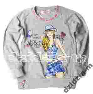 Super bluzka z dziewczyną w kapeluszu. Na bluzce brokat i dżety. Przy rękawkach i na dole ściągacz. Miła w dotyku, materiał dobrej jakości. Skład: 95% bawełna, 5% elastan