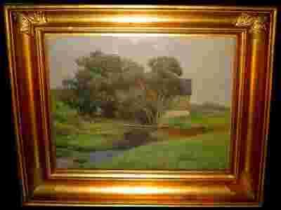 E. Olsen 1[zasłonięte]876-19: Dworek za drzewami nad rzeczka