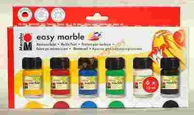 Za pomocą farb Easy Marble firmy Marabu możemy stworzyć marmurkowy wzór na różnych powierzchniach. Idealnie sprawdzają się na plastikowych jajkach, szklanych bombkach, obiektach szklanych i plastikowych, metalu, papierze,świeczkach. Czas schnięcia farby wynosi ok 15 min. Wzór po namalowaniu nie jest wodoodporny, możemy go dodatkowo zabezpieczyć lakierem.