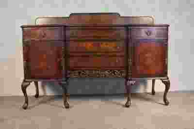 Wspaniały, bardzo efektowny bufet wykonany ok. połowy ub. wieku, fornirowany szlachetnym drewnem orzechowym o pięknym rysunku (wybarwiony na ciemny kolor). Mebel zdobiony jest przepiękną, kunsztowną snycerką. Bufet zachowany jest w stanie dobrym, nosi ślady użytkowania. Szkodników nie ma. Brak jednego uchwytu w szufladzie.
