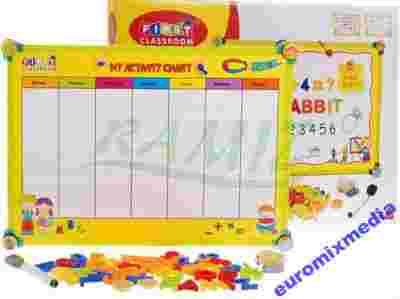 Dwustronną tablicę z praktycznym planem lekcji zaprojektowano w ten sposób, aby pobudzać rozwój dziecka na kilku płaszczyznach równocześnie.
