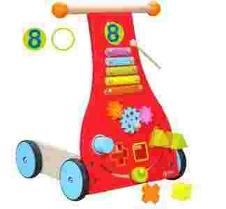 Specjalnie zaprojektowany pchacz-chodzik ułatwia dziecku naukę chodzenia.