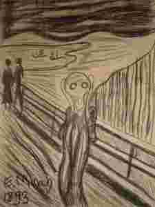 Z tyłu obrazu numer obrazu oraz podpisany Edvard Munch ,,Krzyk" 1893