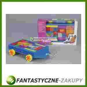 Drewniany wózeczek ze sznurkiem, a w nim 24 kolorowe klocki. Zabawka jest przeznaczona dla dzieci 2 letnich i starszych. Rozmiar: 28 x 18 x 7 cm