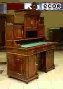 Sekretera eklektyczna pochodząca z końca XIX wieku. W nadstawce 3 szafki, jedna z podwójnymi drzwiami z pilastrami po bokach. Korona w kształcie muszelki. Na blacie mebla jasnozielone płótno. Pod blatem trzy szuflady. Dolne szuflady równiez ozdobione pilastrami. Na wszystkich powierzchniach mebla wyrazisty rysunek drewna.