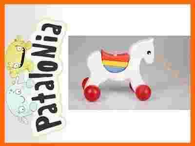 Kolorowy konik na kółkach z przymocowanym sznurkiem służącym do ciągnięcia.