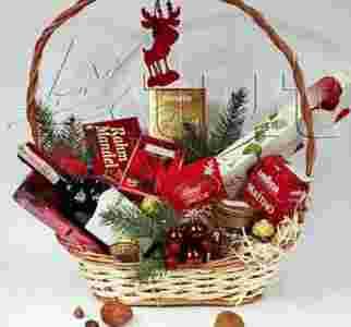 Całość jest utrzymana w eleganckiej złoto – czerwonej kolorystyce. W wersji świątecznej proponujemy do każdego kosza zawieszkę w formie zabawnego
