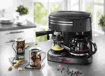 Ekspres wielofunkcyjny do przygotowania pysznego aromatycznego espresso, cappuccino, latte macchiato lub smacznej klasycznej kawy z filtra przelewowego . Dzbanek szklany o pojemności 1,25 litra (10 filiżanek) kawy. Zbiornik na wodę 1,2 litra, funkcja zabezpieczenia przed kapaniem, podgrzewacz dzbanka. Dzbanek szklany 250 ml (4 filiżanki) do espresso. Do 4 bar ciśnienia pompy do doskonałej pianki. Dostarczany z wymiennym dyszy pary do spieniania mleka. Taca na skropliny. Łatwe do czyszczenia. 1300 Watt.