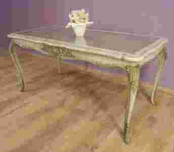Jej blat posiada kształtprostokątny. W szerokie obramowanie blatu wkomponowana jest szyba pod którą umieszczono rafię, a w jej środkowej części jest piękny element dekoracyjny. Pod blatem wkomponowano falistą, płaskorzeźbioną listwę. Ława spoczywa na pięknie rzeźbionych, kabriolowych nóżkach.