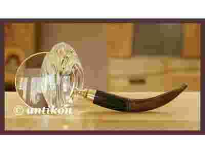 PIĘKNA MASYWNA LUPA. NIEZWYKLE EFEKTOWNA RĘKOJEŚĆ W KSZTAŁCIE ROGU I OKUCIE Z POLEROWANEGO MOSIĄDZU. CZYSTE SZKŁO, POWIĘKSZENIE 5 X. PRZEDMIOT ŚWIETNIE WYKOŃCZONY I BARDZO SOLIDNY. IDEALNIE NADAJE SIĘ NA ELEGANCKI PREZENT LUB DLA WŁASNYCH POTRZEB.