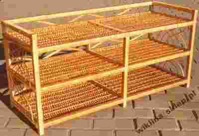 Przedmiotem aukcji jest komoda wykonana z taśmy wiklinowej na drewnianym stelażu. Tył szafki nie jest wypleciony taśmą.