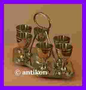 Bardzo efektowny zestaw do podawania jajek wykonany z platerowanego metalu. Komplet składa się z 6 kieliszków, szklanej solniczki oraz pięknie wyprofilowanej tacy z uchwytem. Ten stary kabaret będzie się rewelacyjnie prezentować ustawiony w serwantce lub witrynie. Dzięki swej ponadczasowej elegancji znakomicie sprawdzi się podczas odświętnego śniadania i z pewnością wprawi w zachwyt wszystkich gości. Uświetni także mniej uroczysty posiłek przywołując atmosferę wyrafinowanego szyku. Stan zachowania przedmiotu bardzo dobry.