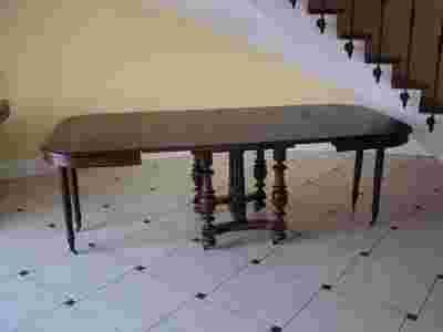 Wykonany we Francji pod koniec XIX wieku. Posadowiony na czterech toczonych nogach zakończonych charakterystycznymi dla stylu kółeczkami, które ułatwiają jego przesuwanie. Nogi połączone ze sobą profilowanymi łączynami i dodatkowo poprzecznie ozdobnymi tralkami w kształcie arkad. Blat stołu ma kształt prostokąta, zaokrąglony w narożach. Stół rozkłada się poprzez rozsunięcie blatów i dołożeniu dodatkowych wstawek. Po rozłożeniu widoczne są dodatkowo dwie pary smukłych nóżek. Rozkładać go można z każdą wstawką z osobna.Rant blatu mebla został zakończony ozdobnym, szerokim frezem. Stół wykonany w całości z litego drewna orzechowego pokryty naturalną patyną. Wstawki wykonane współcześnie z litego drewna olchowego barwione w kolorze orzechu.