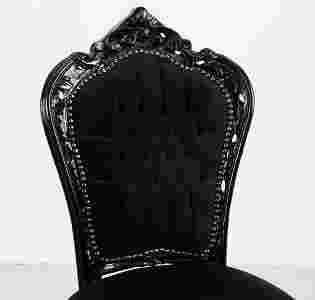 Stylowe i efektowne krzesełko w modnej czerni . Dekoracyjny wygląd to przede wszystkim zasługa jego twórcy ponieważ mebel został wykonany tzw.techniką ,, hand made,, czyli ,że jest to robota ręczna której wykonawca z wielkim kunsztem i finezją wiernie odwzorował elementy charakterystyczne dla epoki baroku. Zgrabny profil oraz solidna i stabilna konstrukcja krzesła wykonana została z drewna bukowego pokrytego powłoką czarną lakierowaną . Siedzisko obszerne i wygodne na sprężynach z dodatkiem tworzywa piankowego pokrytego tapicerką pluszową w kolorze czarnym z delikatnym satynowym blaskiem.