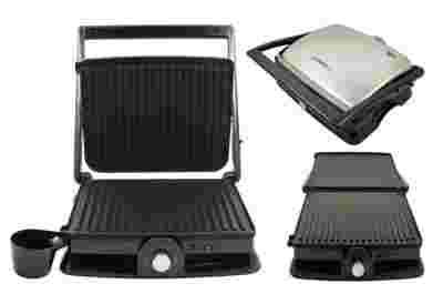 Elektryczny grill został wykonany ze stali nierdzewnej, płyty zostały pokryte powłoką teflonową zapobiegającą przywieraniu.