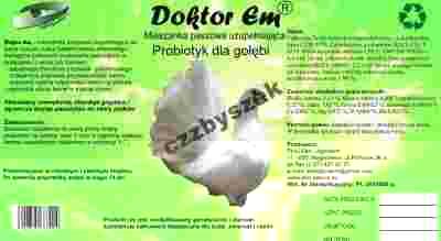 Doktor Em dla gołębi - probiotyczna mieszanka paszowa uzupełniająca na bazie żywych kultur bakterii kwasu mlekowego i wyciągów ziołowych, podawana zwierzętom w połączeniu z wodą lub ziarnem: