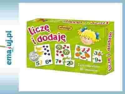 Układanka Liczę i dodaję składa się z 48 puzzli, z których można ułożyć 16 kompletów. Na każdy z nich składa się duży puzzel z obrazkiem dwóch rodzajów owoców oraz dwa mniejsze z cyframi i owocami, które odpowiadają liczbie owoców z dużego puzzla. W środku pudełka znajduje się instrukcja z opisem dwóch gier. Zestaw można również wykorzystać jako układankę podczas zabawy z jednym dzieckiem.