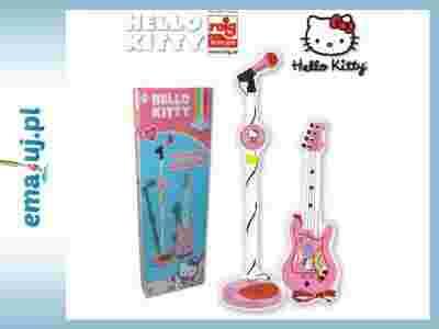 Mikrofon na statywie z regulowaną wysokością oraz gitara elektroniczna z głośnikiem. Wszystko ozdobione naklejkami z Hello Kitty. Producent nie załączył baterii, wymagane 4xAA.