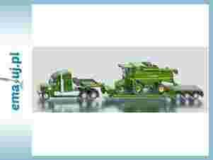 Zestaw zawiera metalowy model ciągnika siodłowego zplatformą oraz kombajn.