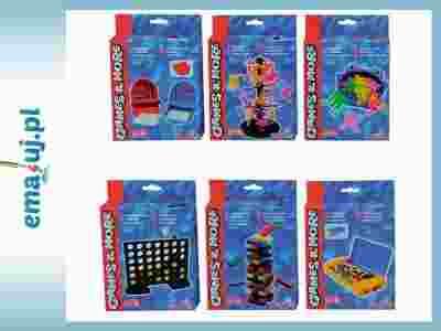 Do wyboru jedna z 6 wspaniałych gier podróżnych. Cena obejmuje 1 sztukę. Możliwość zakupu całego dispalyu, w którym znajduje się 60 sztuk ( po 10 sztuk z każdego tytułu).Dostępne gry:1. Małpie przyjęcie (Monkey Party),2. Tajny kod (Secret code),3. 4 w rzędzie L ( 4 in a row L),4. Bitwa morska (Sea battle) potocznie zwana Grą w Statki,5. Wieża równowaga (Balance-tower),6. Gra w żabki (Frog game).Gra przeznaczona są dla 2 do 4 graczy w wieku od 5 lat. Ze względu na niewielkie rozmiary opakowań, świetnie nadaje się do urozmaicenia czasu dzieciom zwłaszcza w podróży.Wewnątrz opakowań znajduje się instrukcja w języku polskim.