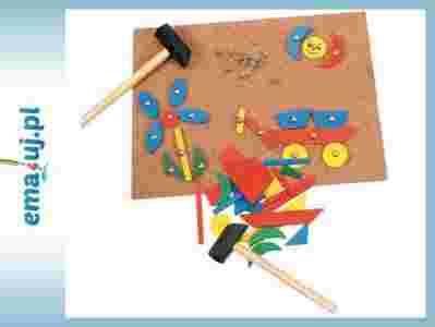 Kreatywna zabawa z przybijaniem elementów do tablicy korkowej. Wymaga twórczego podejścia do zbudowania różnych wzorów z pojedynczych elementów, przybicia ich gwoździami z zaokrągląną główką do korkowej tablicy.