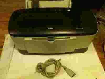 Drukarka niesprawdzona, najprawdopodobniej w pełni działająca, jednak nie mam jak tego sprawdzić, gdyż dostałem ją bez atramentu. Po podłączeniu do prądu i do komputera reaguje normalnie. W zestawie kabel zasilający. Brak oryginalnego pudełka, instrukcji, oprogramowania, kabla USB, kartridżów z tuszem (są osiągalne na allegro za nieduże pieniądze). Drukarka nie posiada także tylnego wspornika do papieru, jednak nie powinno to przeszkadzać w normalnej eksploatacji.