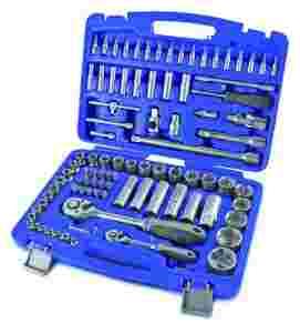 Zestaw kluczy nasadowych 94 elementowy firmy Erba w walizce z tworzywa sztucznego. W zestawie znajdują się 2 różnej wielkości grzechotki. Wszystkie elementy wykonane zostały ze stali chromowo-wanadowej.